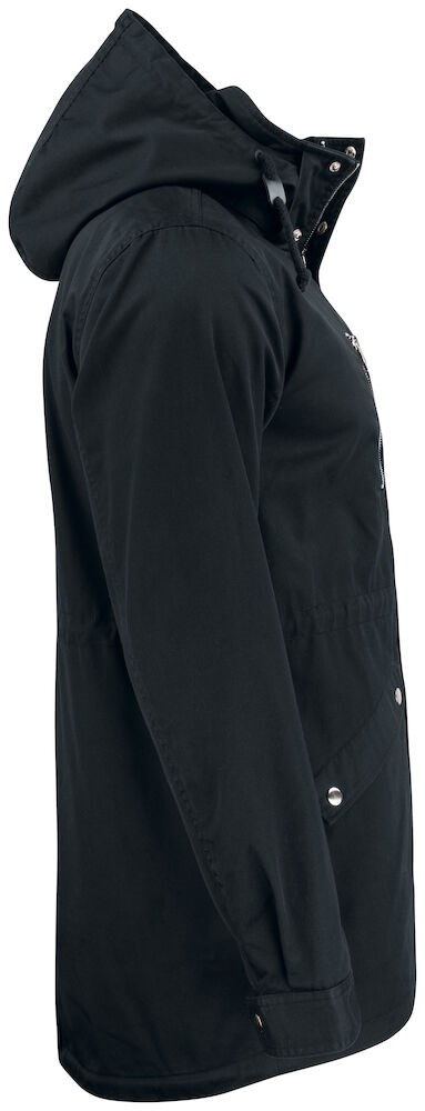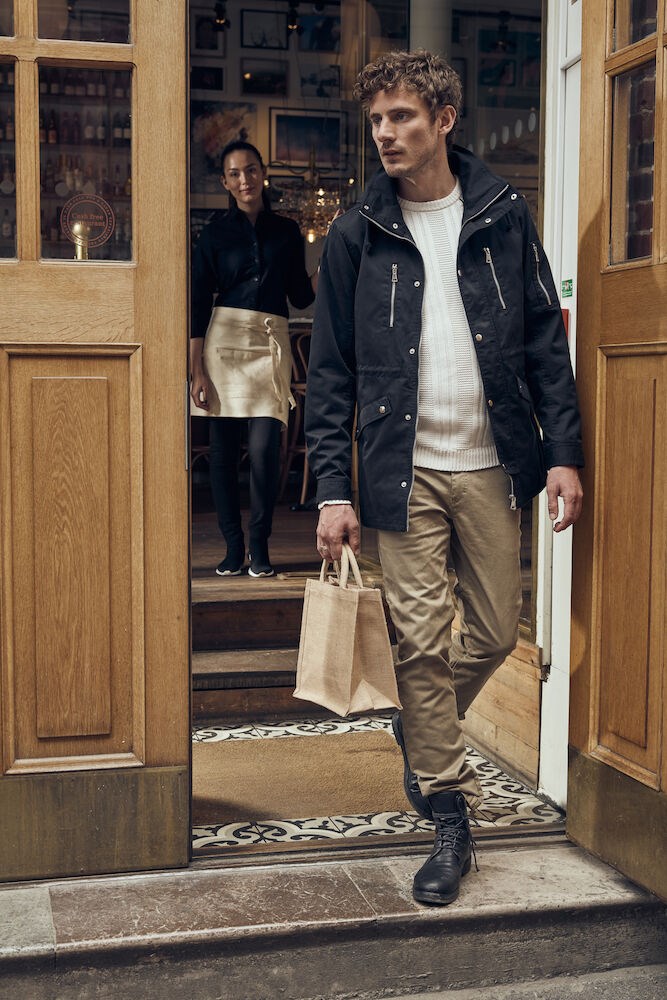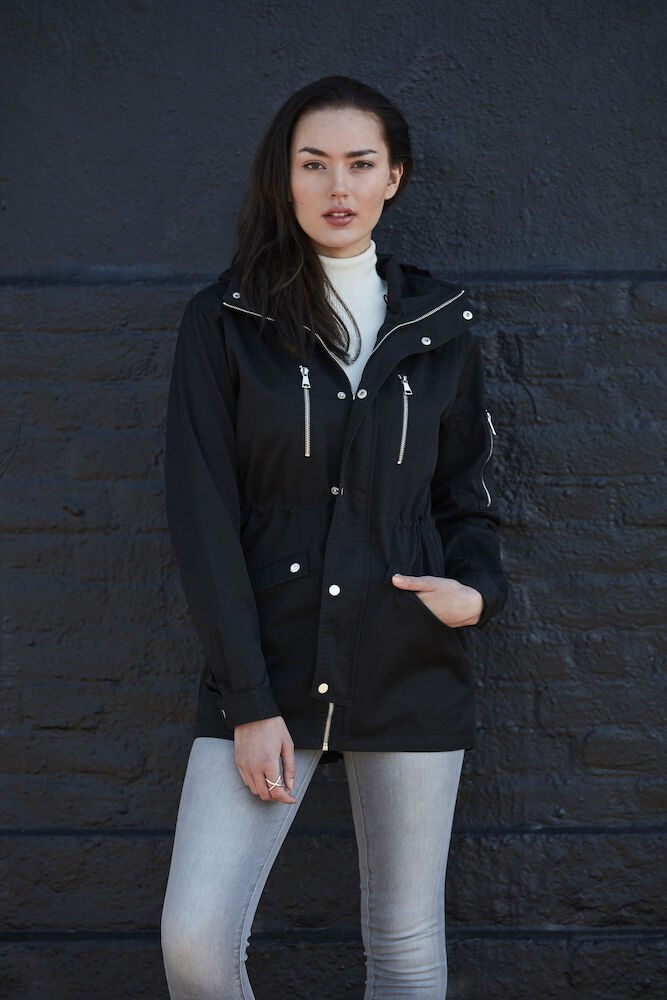 Luchtige jas met dunne voering en eigentijdse uitstraling door de afwerking met metalen ritsen en drukknopen. De jas is voorzien van een capuchon die kan worden weggestopt in de kraag. De zakken op de borst, voorzijde, mouw en aan de binnenzijde zorgen voor voldoende opbergruimte. De jas is gemakkelijk te veredelen dankzij de drukkersrits aan de binnenzijde. Kortom, de ideale tussenjas.