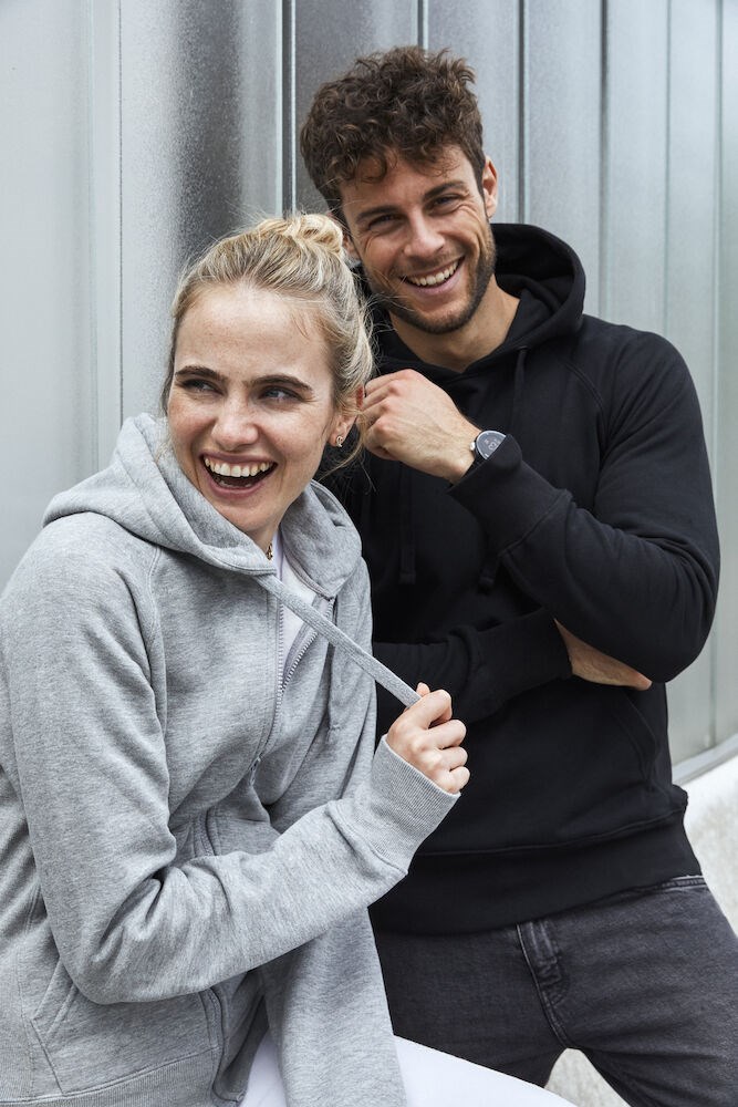 Modern vest met capuchon en raglan mouwen voor een eigentijdse uitstraling. Het vest is voorzien van rib in de zijpanelen en boorden. Verder heeft het vest een buidelzak, handige oplossing voor een koptelefoon en een verborgen zak. Het vest is professioneel afgewerkt met visgraat necktape en metalen oog voor het trekkoord. De behandelingen met softener en enzymen zorgen ervoor dat het vest zacht en glad aanvoelt.