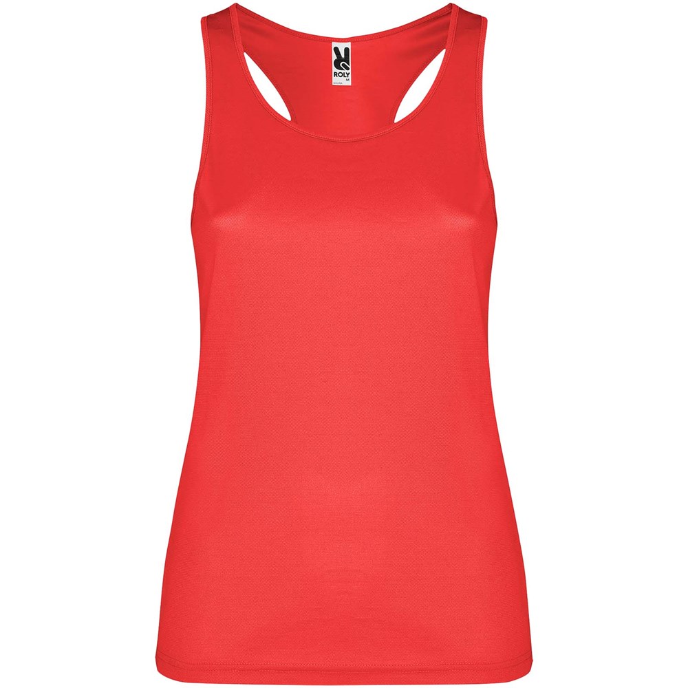 Technische, ademende, gemakkelijk te wassen en te drogen stof. Geribde armsgaten en halslijn. Racerback en zijnaden. Verwijderbaar label.