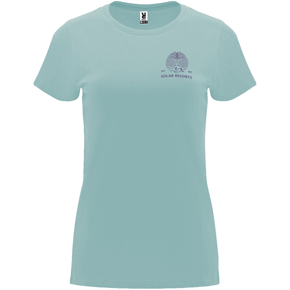 Getailleerd T-shirt met korte mouwen voor dames. 1x1 geribde ronde hals. Versterkte bedekte naden in de kraag. Verwijderbaar etiket.